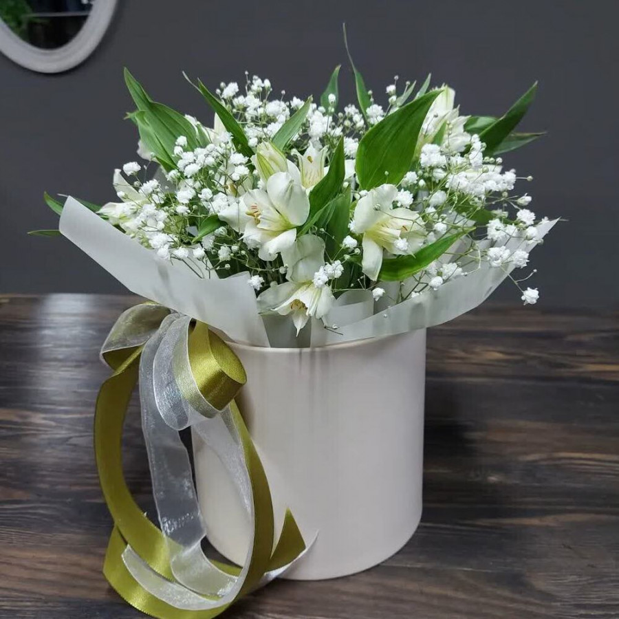 Белые альстромерии с гипсофилами в шляпной коробке в Армавире