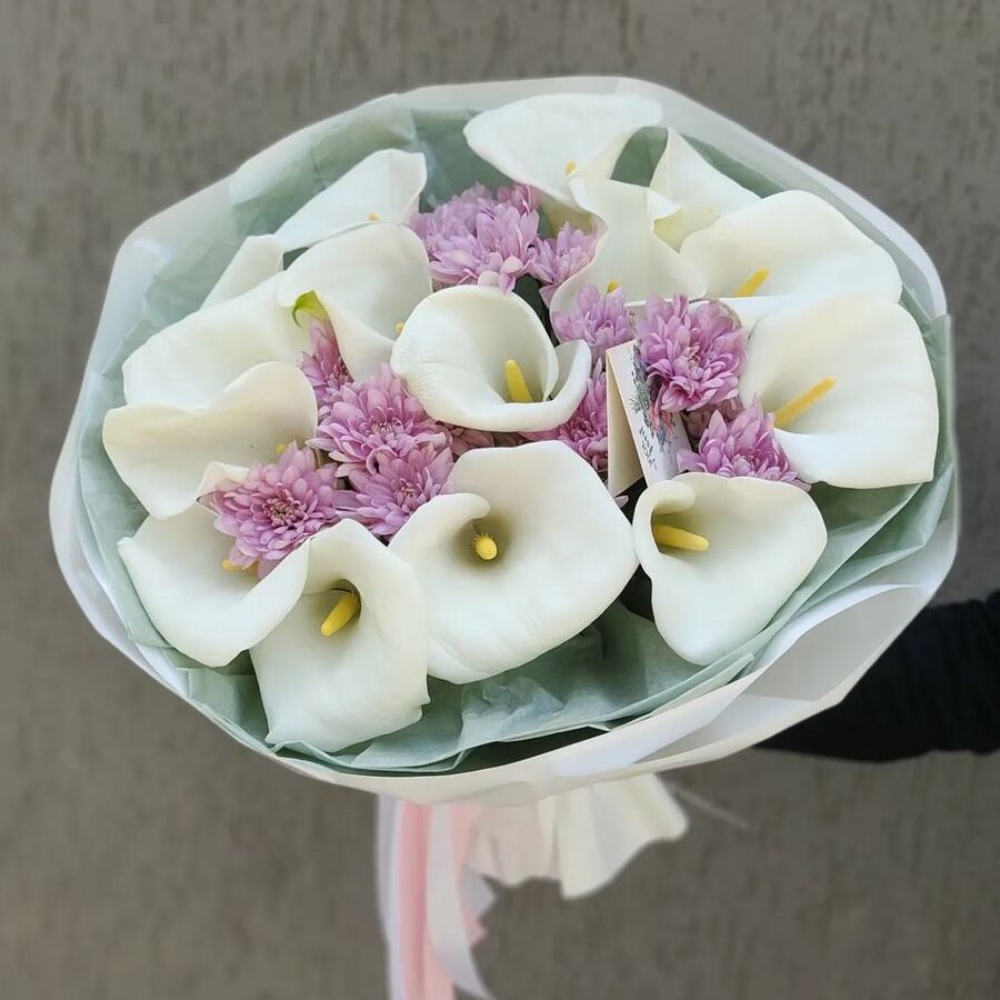 На фото букет из калл и хризантем. В составе: ferrero rocher 15 шт, хризантема кустовая 2 шт, крафт-бумага 1 шт, атласная лента 1 шт, . Все цветы свежие и ароматные, букет красиво оформлен и отлично подходит для подарка. Доступна доставка цветов или самовывоз.
