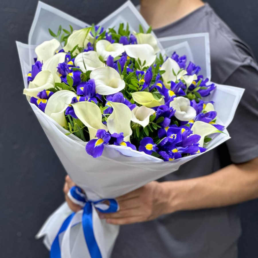 На фото букет из белых калл и синих ирисов. В составе: калла 19 шт, ирис 20 шт, писташ 9 шт, дизайнерская упаковка 3 шт, атласная лента 1 шт, . Все цветы свежие и ароматные, букет красиво оформлен и отлично подходит для подарка. Доступна доставка цветов или самовывоз.