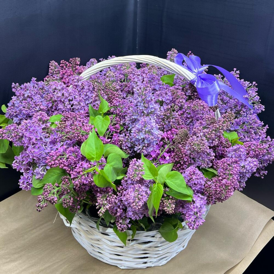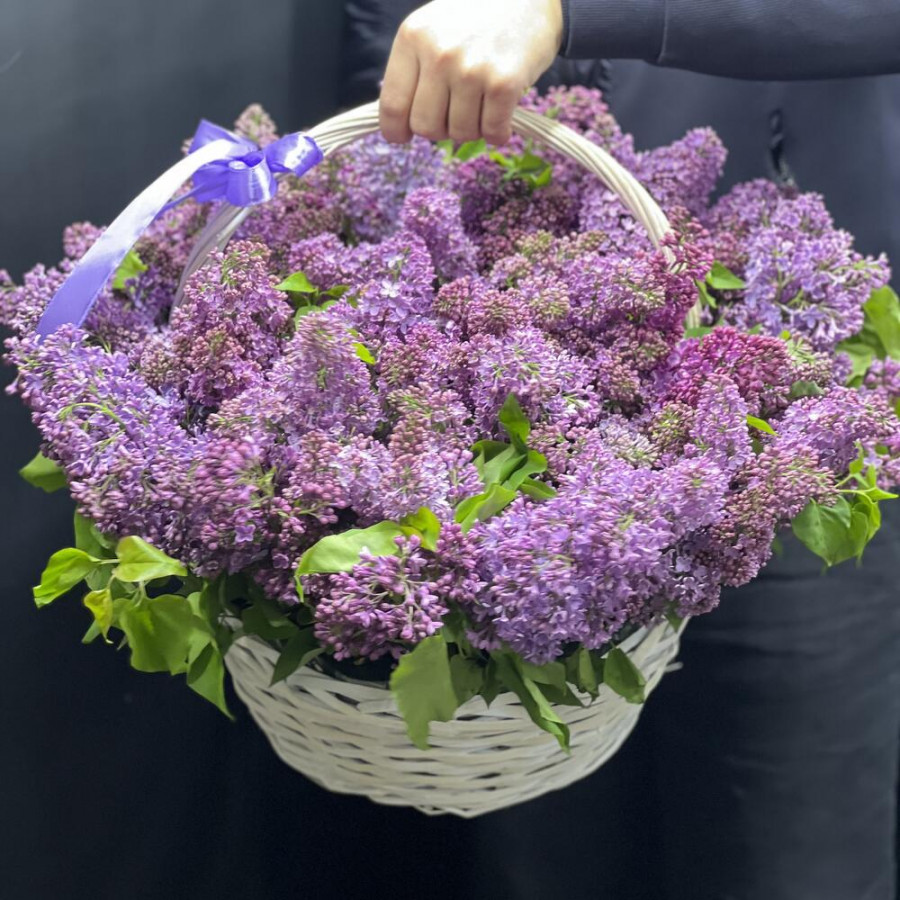 На фото композиция с сиренью в корзине. В составе: сирень 41 шт, оазис флористический 4 шт, корзина (xl) 1 шт, . Все цветы свежие и ароматные, букет красиво оформлен и отлично подходит для подарка. Доступна доставка цветов или самовывоз.